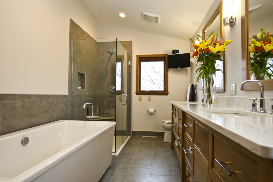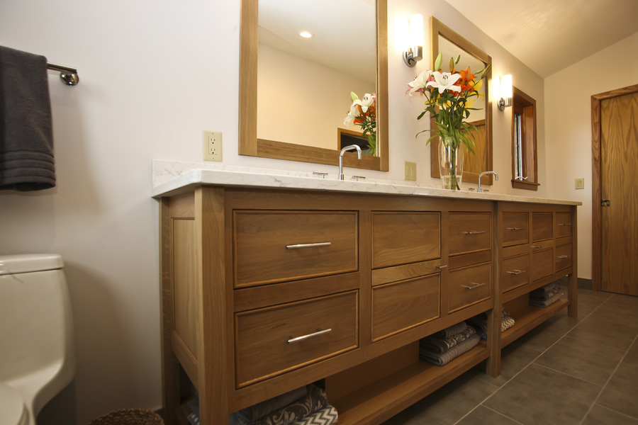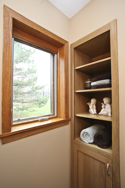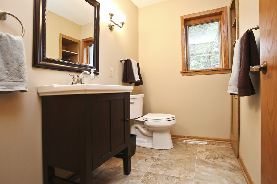 To make our client’s wishes a reality, we rearranged the fixtures in the master bath to improve the space’s flow; with the half bath, we added a convenient built-in storage area.